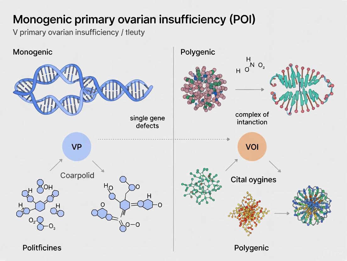 Figure 1: Contrasting Biological Pathways in Monogenic vs. Polygenic POI. Monogenic forms disrupt specific critical pathways leading to rapid follicle depletion, while polygenic forms subtly affect multiple systems resulting in gradual decline.