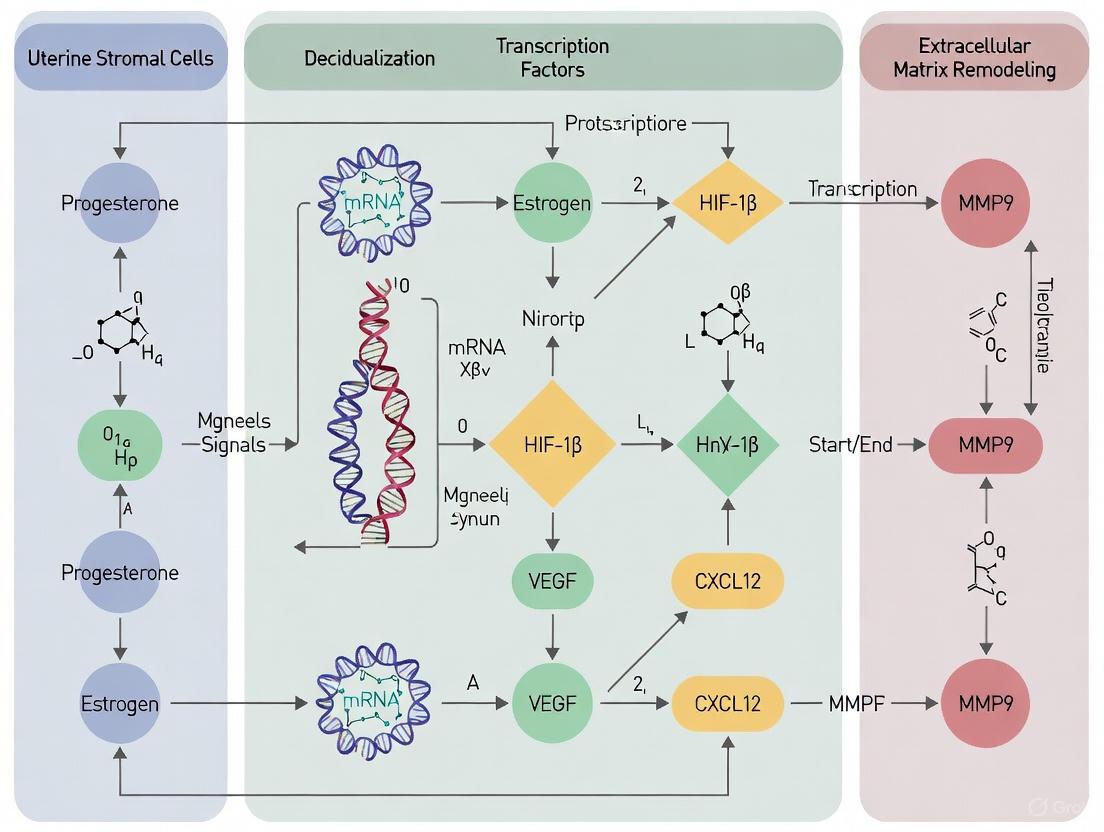 These markers delineate specific functional subpopulations and pathological states. For instance, a "mosaic state" within the stroma, characterized by the coexistence of IGFBP1+ decidualized cells and SFRP4+/MMP11+ proliferative stromal cells, has been identified as a hallmark of decidualization resistance (DR) in patients with a history of severe preeclampsia (sPE) [15]. Furthermore, the activation of estrogen receptor alpha (ESR1) drives a distinct transcriptional program that regulates not only classical decidualization but also inflammation, proliferation, and cancer-related pathways, as evidenced by the upregulation of ERRFI1, NRIP1, and EPAS1 [8].