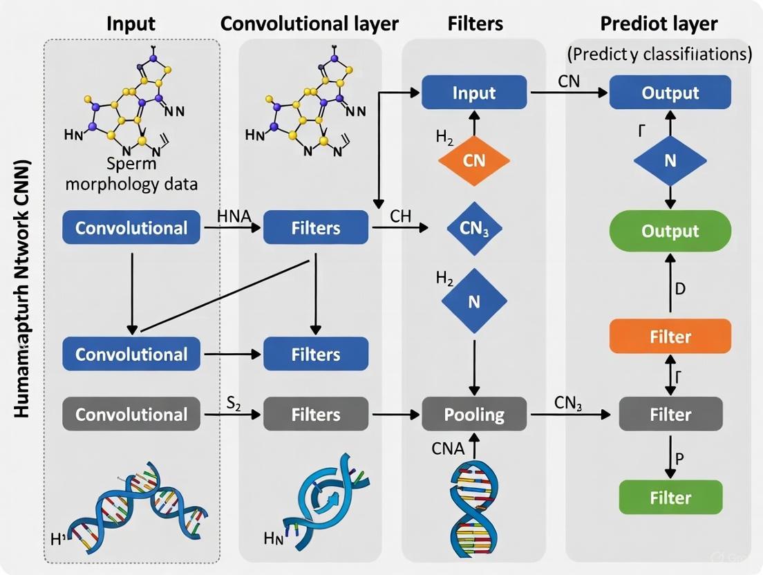 The integration of Convolutional Neural Networks (CNNs), a class of deep learning algorithms, presents a paradigm shift for andrology laboratories. CNNs are uniquely suited for image analysis tasks as they can learn hierarchical features directly from pixel data, automating the classification process and minimizing human bias [3] [4]. This document outlines the application of a CNN-based framework for the standardization of human sperm morphology classification, detailing the experimental protocols, data handling procedures, and technical specifications required for robust implementation.