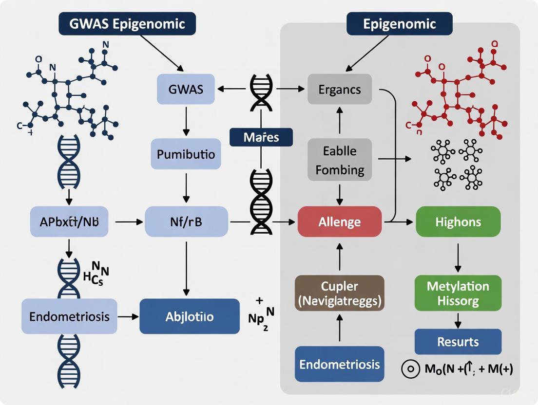 This article synthesizes the latest advances in integrating genome-wide association studies (GWAS) with epigenomic data to elucidate the pathogenesis of endometriosis. It explores how multi-ancestry GWAS discoveries are being functionally characterized through DNA methylation, histone modifications, and multi-omic quantitative trait locus (QTL) analyses. The content details methodological frameworks for data integration, addresses key challenges in study design and validation, and highlights emerging applications for identifying robust biomarkers and repurposing drugs. Aimed at researchers and drug development professionals, this review provides a comprehensive roadmap for translating genetic associations into a mechanistic understanding of endometriosis and novel therapeutic strategies.