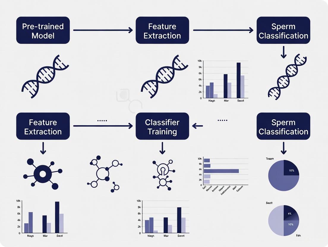 This diagram illustrates the conceptual process of transfer learning as applied to sperm morphology classification.