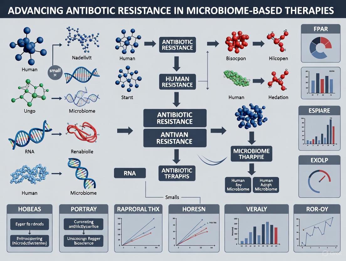 The advancement of microbiome-based therapies is intrinsically linked to the global challenge of antimicrobial resistance. A multifaceted approach is essential, combining a deep understanding of gut microbial ecology with robust clinical validation and thoughtful regulation. Key takeaways include the critical role of colonization resistance, the promising yet complex application of FMT and defined consortia for decolonization, and the urgent need to address the risks of horizontal gene transfer within therapeutic products. Future directions must prioritize the development of standardized, safety-focused manufacturing, the creation of innovative economic models to sustain antibiotic alternative development, and the implementation of advanced metagenomic tools for real-time therapeutic monitoring. For biomedical and clinical research, the path forward lies in fostering interdisciplinary collaboration to design next-generation therapies that not only treat disease but also proactively safeguard our diminishing antibiotic resources.
