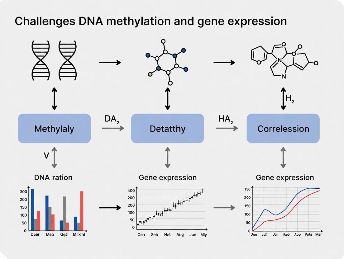 Correlating DNA methylation with gene expression requires navigating a complex landscape of biological nuance, methodological limitations, and analytical challenges. Successful studies must account for genomic context, address technical artifacts through rigorous validation, and employ appropriate statistical models for multi-omics integration. The emergence of single-cell multi-omics, long-read sequencing, and advanced machine learning approaches promises to overcome current limitations by enabling simultaneous measurement of methylation and expression in individual cells and across haplotype-resolved genomic regions. For biomedical and clinical research, these advancements will accelerate the identification of functionally relevant epigenetic biomarkers for diagnostic development and targeted epigenetic therapies, ultimately bridging the gap between correlation and causation in epigenetic regulation.