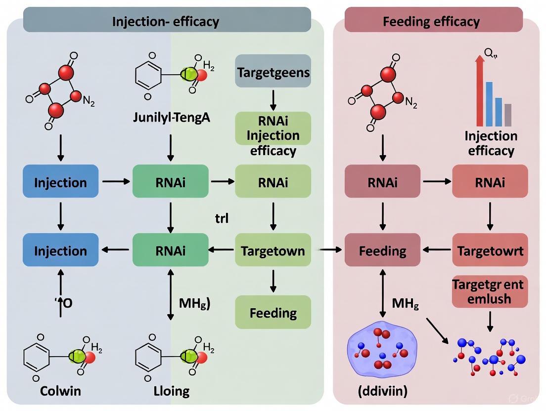 This flowchart outlines a generalized experimental design for directly comparing injection and feeding RNAi efficacy, incorporating key assessment metrics.