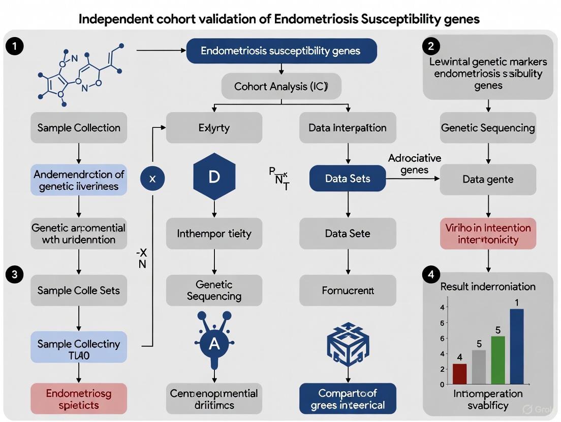 Independent cohort validation remains the cornerstone of establishing credible genetic associations in endometriosis research. Successful validation requires meticulous study design that accounts for the disease's polygenic architecture, phenotypic heterogeneity, and potential gene-environment interactions. The integration of multiple evidence streams—from statistical genetics and functional genomics to cross-population comparisons—provides a robust framework for distinguishing true susceptibility genes from false positives. Future directions should prioritize multi-ancestry cohorts to enhance generalizability, develop standardized phenotypic classification systems to reduce heterogeneity, and implement functional genomic approaches to elucidate biological mechanisms. For drug development professionals, validated genetic targets offer promising avenues for novel therapeutic interventions, while researchers can leverage these findings to develop much-needed non-invasive diagnostic tools and personalized treatment strategies for this complex condition.